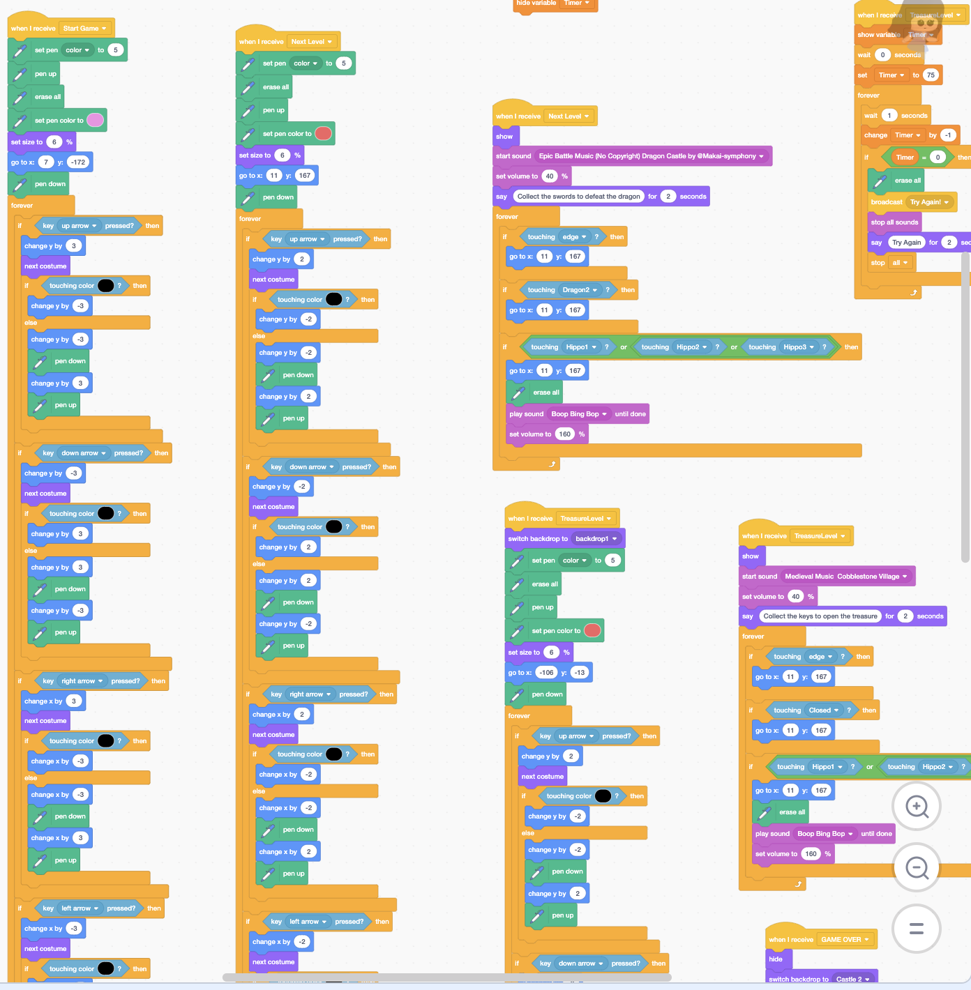 Through creating this multi-level Scratch maze game, I developed a deeper understanding of block-based programming, including the use of loops, conditional logic, and event-driven design. I learned how to make a character die and respawn under certain conditions, which involved managing variables like health and checkpoints, as well as using broadcasts to trigger scene resets.